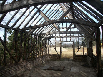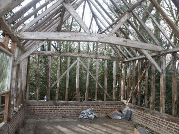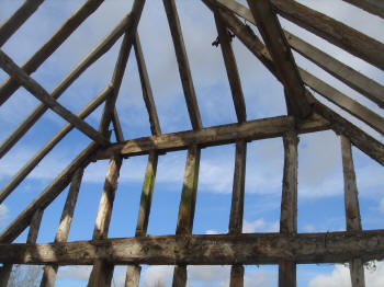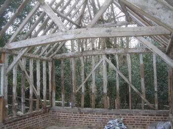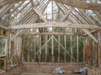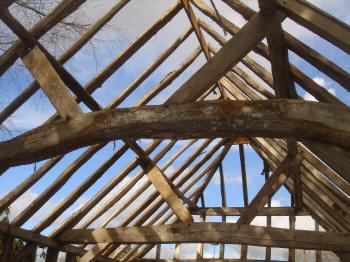 Four-bay queen strut side purlin roof with much character.